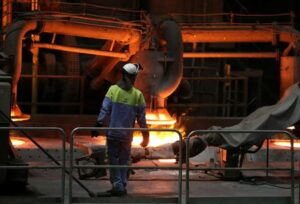 FILE PHOTO: A worker is seen at the Tata steel plant in Ijmuiden, Netherlands April 3, 2019. Picture taken April 3, 2019. REUTERS/Yves Herman/File Photo