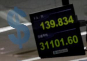 FILE PHOTO: A sign of U.S. dollar is seen next to a monitor showing the current Japanese Yen exchange rate against the U.S. dollar and Nikkei share price index at the foreign exchange trading company Gaitame.com in Tokyo, Japan, May 26, 2023. REUTERS/Kim Kyung-Hoon