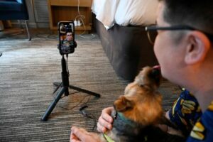 Vitus “V” Spehar, 40, who discusses relevant national news with their 2.9 million TikTok followers, live streams on Tiktok as they comment on the news of the day and announce upcoming social media content to 2,000 viewers, in New York, U.S., May 13, 2023. REUTERS/Magali Druscovich