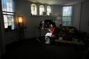 Kristy Drutman, 27, who creates climate conscious content for her 78.8 million TikTok and Instagram followers, edits a video for her social media accounts at home in Weehawken, New Jersey, U.S., May 6, 2023. REUTERS/Magali Druscovich