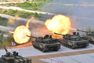 South Korea’s K-2 tanks fire during a South Korea-US joint military drill at Seungjin Fire Training Field in Pocheon, South Korea June 15, 2023. Jung Yeon-je/Pool via REUTERS