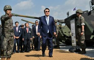 South Korean President Yoon Suk Yeol (C) looks around military vehicles after a South Korea-US joint military drill at Seungjin Fire Training Field in Pocheon, South Korea June 15, 2023. Jung Yeon-je/Pool via REUTERS