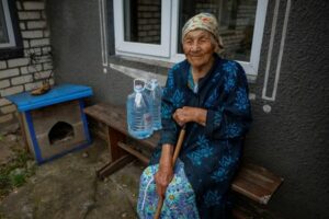 Hanna, a resident of the village of Hrushivka, sits next to bottles of drinking water, which she got from the local authorities, as the water level in Kakhovka reservoir has sharply dropped, after the destruction of the Kakhovka dam, amid Russia’s attack on Ukraine, in the village of Hrushivka, Dnipropetrovsk region, Ukraine June 14, 2023. REUTERS/Alina Smutko