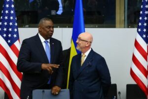 Ukraine’s Defense Minister Oleksii Reznikov and U.S. Secretary of Defense Lloyd Austin attend a meeting of the Ukraine Defense Contact Group, as a part of a NATO Defence Ministers’ meeting at the Alliance’s headquarters in Brussels, Belgium June 15, 2023. REUTERS/Yves Herman