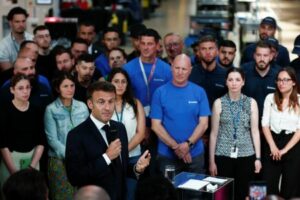 French President Emmanuel Macron delivers a speech during a visit at the Safran Aircraft Engines site in Villaroche, near Paris, to tackle the decarbonization of the aviation industry ahead of the Le Bourget Air Show, France, June 16, 2023. REUTERS/Gonzalo Fuentes/Pool