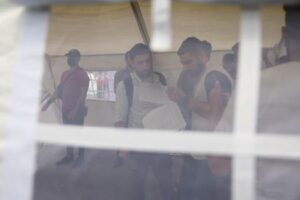 Syrian Kassam Abozeed, 34, who says his wife Israa and brother-in-law were onboard a boat with migrants that capsized at open sea off Greece, speaks to an official at the port of Kalamata, Greece, June 15, 2023. REUTERS/Stelios Misinas