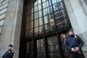 FILE PHOTO: Federal Reserve and New York City Police officers stand guard in front of the New York Federal Reserve Building in New York, October 17, 2012. REUTERS/Keith Bedford/File Photo