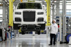 An employee checks an Aurus Senat car on an assembly line of the Aurus manufacturing plant in the town of Yelabuga in the Republic of Tatarstan, Russia May 31, 2021. REUTERS/Alexey Nasyrov/File Photo