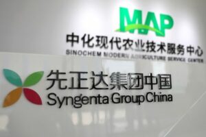 Syngenta Group China sign hangs at its Modern Agriculture Platform’ (MAP) service centre, during a media tour in Wei county of Handan, Hebei province, China June 11, 2021. Picture taken June 11, 2021. REUTERS/Tingshu Wang/File Photo