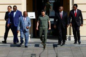 Egypt’s Prime Minister Mustafa Madbuly, Senegal’s President Macky Sall, President of the Union of Comoros Azali Assoumani, Ukraine’s President Volodymyr Zelenskiy, South African President Cyril Ramaphosa and Zambia’s President Hakainde Hichilema walk to attend a joint press conference, amid Russia’s attack on Ukraine, in Kyiv, Ukraine June 16, 2023. REUTERS/Valentyn Ogirenko