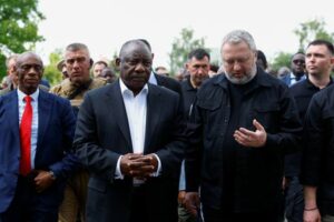 South African President Cyril Ramaphosa and Ukraine’s Prosecutor General Andriy Kostin visit a site of a mass grave, in the town of Bucha, amid Russia’s attack on Ukraine, outside of Kyiv, Ukraine June 16, 2023. REUTERS/Valentyn Ogirenko