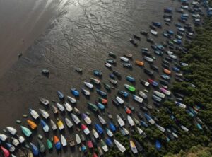 FILE PHOTO: An aerial view of fishing boats covered with tarpaulin sheets parked on the shore, before the start of the monsoon season, on the outskirts of Mumbai, India, June 8, 2023. REUTERS/Francis Mascarenhas/File Photo