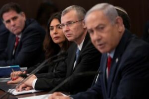 Israeli Prime Minister Benjamin Netanyahu, right, and Minister of Justice Yariv Levin attend a weekly cabinet meeting in the prime minister’s office in Jerusalem, June 18, 2023. Ohad Zwigenberg/Pool via REUTERS