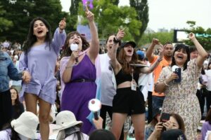 Fans of the K-pop boy band BTS react as they listen to the BTS member RM’s radio show during BTS 10th Anniversary FESTA in Seoul, South Korea, June 17, 2023. REUTERS/Kim Soo-hyeon
