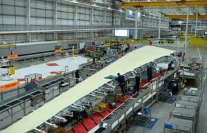 FILE PHOTO: Members of staff work on an airplane wing at the division manufacturing the wings for the A350 at the Broughton Airbus plant during a visit from British Prime Minister Boris Johnson (not pictured), in Chester, Britain, August 12, 2022. Oli Scarff/Pool via REUTERS