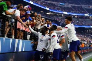 Folarin Balogun (20) festeja con los aficionados y con sus compañeros el gol que anotó en la final de la Liga de Naciones de la Concacaf que Estados Unidos ganó a Canadá. Estadio Allegiant, Las Vegas, Nevada, EEUU. 18 de junio de 2023.
