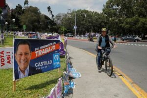 FILE PHOTO: A person rides a bicycle next to posters of candidates for the general elections, in Guatemala City, Guatemala, March 27, 2023. REUTERS/Luis Echeverria/File Photo