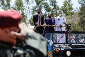 Defense Minister Jose Manuel Zelaya, Honduras President Xiomara Castro and Rear Admiral Jose Jorge Fortin Aguilar review the troops before Castro received the baton of command as the Constitutional President of the Republic and Commander General of the Armed Forces, in Tegucigalpa, Honduras February 25, 2022. REUTERS/Fredy Rodriguez/FILE PHOTO