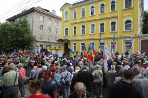 Supporters of Moldova’s opposition pro-Russian political party Shor attend a rally before a hearing of the Constitutional Court held to verify the constitutionality of the party in Chisinau, Moldova, June 19, 2023. REUTERS/Vladislav Culiomza
