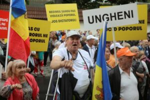 Supporters of Moldova’s opposition pro-Russian political party Shor shout slogans during a rally before a hearing of the Constitutional Court held to verify the constitutionality of the party in Chisinau, Moldova, June 19, 2023. REUTERS/Vladislav Culiomza