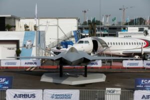 A model of a Future Combat Air System (SCAF), a European aircraft developed by France, Germany and Spain is displayed during the 54th International Paris Airshow at Le Bourget Airport near Paris, France, June 19, 2023. REUTERS/Benoit Tessier