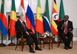 Russian President Vladimir Putin and South African President Cyril Ramaphosa attend a meeting in Saint Petersburg, Russia June 17, 2023. Ramil Sitdikov/Host photo agency RIA Novosti via REUTERS