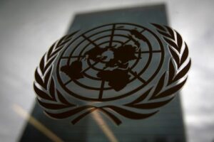 FILE PHOTO: The United Nations headquarters building is pictured though a window with the UN logo in the foreground in the Manhattan borough of New York August 15, 2014. REUTERS/Carlo Allegri/File Photo