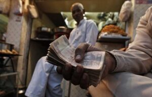 A street side restaurant owner holds a bundle of Indian currency notes as he sits outside his restaurant in New Delhi November 22, 2013/FILE PHOTO