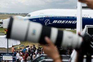 A Boeing 777-9, a variant of the 777X, is pictured before a flying display at the 54th International Paris Airshow at Le Bourget Airport near Paris, France, June 20, 2023. REUTERS/Benoit Tessier