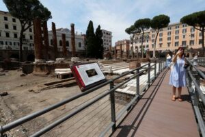 A woman takes a selfie inside the archaeological area of Largo Argentina a day before it reopens to the public after restoration, in Rome, Italy June 19, 2023. REUTERS/Remo Casilli