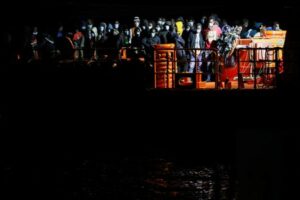 Migrants wait to disembark from a Spanish coast guard vessel, in the port of Arguineguin, in the island of Gran Canaria, Spain, June 20, 2023. REUTERS/Borja Suarez