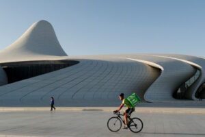 A Bolt Food delivery courier rides a bicycle outside the Heydar Aliyev Center in Baku, Azerbaijan June 18, 2021. REUTERS/Valentyn Ogirenko/FILE PHOTO