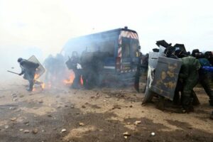 FILE PHOTO: Protesters clash with the gendarmerie during a demonstration called by the collective “Bassines Non Merci” against the “basins” on the construction site of new water storage infrastructure for agricultural irrigation in western France, in Sainte-Soline, France March 25, 2023. REUTERS/Yves Herman/File Photo