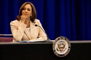 FILE PHOTO: U.S. Vice President Kamala Harris listens during a roundtable discussion at the NAACP National Convention in Atlantic City, New Jersey, U.S., July 18, 2022. REUTERS/Hannah Beier/ File Photo