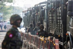 FILE PHOTO: Soldiers stand next to military vehicles as people gather to protest against the military coup, in Yangon, Myanmar, February 15, 2021. REUTERS/Stringer/File Photo
