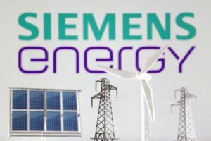 FILE PHOTO: Miniatures of windmill, solar panel and electric pole are seen in front of Siemens Energy logo in this illustration taken January 17, 2023. REUTERS/Dado Ruvic/Illustration/File Photo