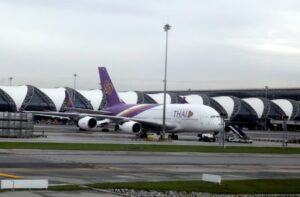 FILE PHOTO: Workers service a Thai Airways Airbus A380-800 aircraft at Bangkok International Suvarnabhumi Airport, Thailand September 3, 2019. REUTERS/Amr Abdallah Dalsh/File Photo