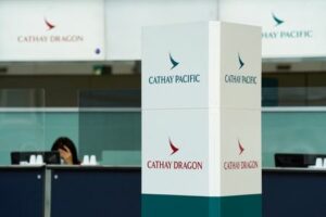 FILE PHOTO: Cathay Pacific and Cathay Dragon logos are seen near a counter at Hong Kong International Airport, China October 20, 2020. REUTERS/Lam Yik/File Photo