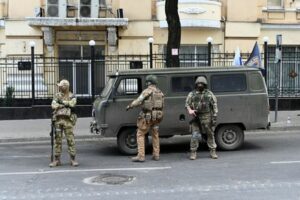 Fighters of Wagner private mercenary group stand guard outside the headquarters of the Southern Military District in the city of Rostov-on-Don, Russia, June 24, 2023. REUTERS/Stringer