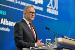 FILE PHOTO: Australia’s Prime Minister Anthony Albanese gives the keynote address for the 20th IISS Shangri-La Dialogue in Singapore June 2, 2023. REUTERS/Caroline Chia/File Photo