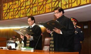 FILE PHOTO: Raja Pervaiz Ashraf, a former prime minister who belongs to the Pakistan Peoples Party (PPP) which is part of the new ruling alliance, takes oath as the 22nd Speaker of the National Assembly of Pakistan from Ayaz Sadiq, a member of the panel of the chairman, at the Parliament House in Islamabad, Pakistan April 16, 2022. Press Information Department (PID) Handout via REUTERS/File Photo