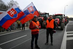 Farmers hold Slovakian flags during a protest against the European Union’s agricultural policies, grievances shared by farmers across Europe, at the Czech-Slovak border near Holic, Slovakia, February 22, 2024. REUTERS/Radovan Stoklasa