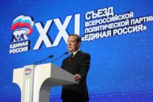 FOTO DE ARCHIVO. Dmitri Medvédev, vicepresidente del Consejo de Seguridad de Rusia y presidente del partido político Rusia Unida, pronuncia un discurso durante el congreso del partido en Moscú, Rusia. 17 de diciembre de 2023. Sputnik/Yekaterina Shtukina/Pool vía REUTERS