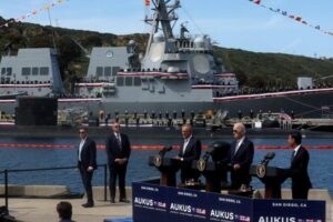 FILE PHOTO: U.S. President Joe Biden, Australian Prime Minister Anthony Albanese and British Prime Minister Rishi Sunak deliver remarks on the Australia – United Kingdom – U.S. (AUKUS) partnership, after a trilateral meeting, at Naval Base Point Loma in San Diego, California U.S. March 13, 2023. REUTERS/Leah Millis/File Photo