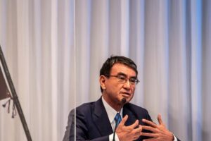 FILE PHOTO: Candidate for the presidential election of the ruling Liberal Democratic Party, Taro Kono, the cabinet minister in charge of vaccinations, speaks at a debate organized by the Liberal Democratic Party, Youth Bureau, Women’s Bureau at the party headquarters, in Tokyo, Japan, September 20, 2021. Philip Fong/Pool via REUTERS/Taro Kono
