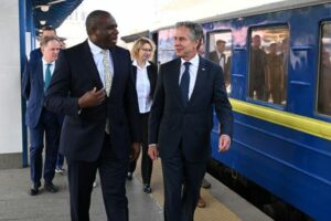 FOTO DE ARCHIVO. El ministro de Asuntos Exteriores británico, David Lammy, y el secretario de Estado estadounidense, Antony Blinken, llegan a la estación de tren de Kiev. 11 de septiembre de 2024. Leon Neal/REUTERS