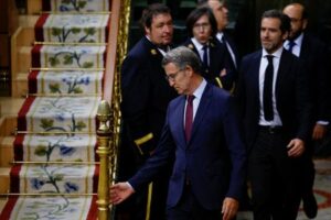 Spain’s opposition leader and People’s Party president Alberto Nunez Feijoo arrives for a vote on a motion set forth by the People’s Party at the Spanish parliament to recognise Venezuelan opposition presidential candidate Edmundo Gonzalez as the winner of Venezuela’s election, in Madrid, Spain, September 11, 2024. REUTERS/Susana Vera
