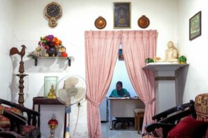 Samudra Jayalath, 61, a supporter of Samagi Jana Balawegaya (SJB) party, works at her home office in Colombo, Sri Lanka August 31, 2024. REUTERS/Thilina Kaluthotage