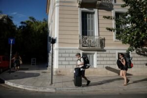 Tourists carry their luggage in the neighborhood of Koukaki, in September 13, 2024 September 13, 2024 Tourists carry their luggage in the neighborhood of Koukaki, in Athens, Greece, September 11, 2024. REUTERS/Louiza Vradi