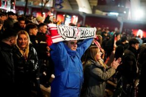 A Rayo Vallecano supporter raises a scarf outside the stadium before the start of the Rayo Vallecano vs Real Madrid match in Madrid, Spain, December 14, 2024. REUTERS/Ana Beltran